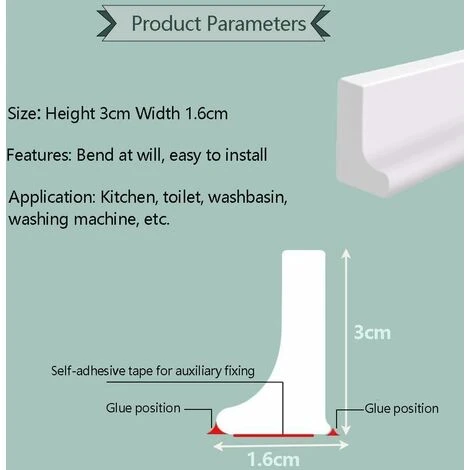 【How To Installation】:First clean and dry the surface, measure and cut the wet room floor water barrier to your length, peel off the red adhesive back strip, stick to the Smooth Surface.NOTION:For Long Use, It Is Must To Use Silicone Sealant(Glue) To Fill The Edges Of The Water Barrier And Dry For 24 Hours Until The Sealants Is Solidified(The Package Do Not Contain Silicone Sealant)!!!