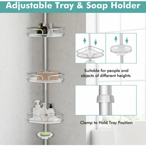 Made of high quality aluminum poles which have excellent rust resistance and high sturdiness, this shower shelf organizer supports years of frequent use. 3 large baskets and a soap tray provide ample storage space for your bathroom necessities, such as shampoo bottles, soaps, conditioners, body wash, towels, razor, toothbrush, cups. Besides, all the baskets can be moved up and down to fit items with different heights and can be secured in position you want by the plastic pipe plugs. The safety bar can not only protect items from falling off, but also hang your towels. Moreover, the drain holes on the baskets and the soap holder help to reduce water accumulation. With strong tension springs, the height of this shower caddy can be easily adjusted from 5ft to 9ft to fit your shower, wash basin, bathtub, kitchen and even every corner. And the installation is no need for drilling or tools.