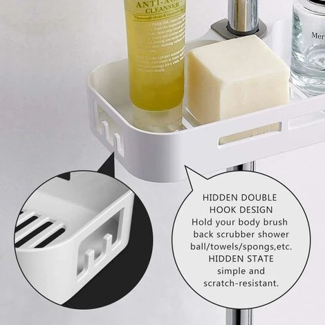 - With two hooks on the left of the bathroom rack,which can be used for hanging body brush back scrubber or the shower ball or little towels or your spongs etc.