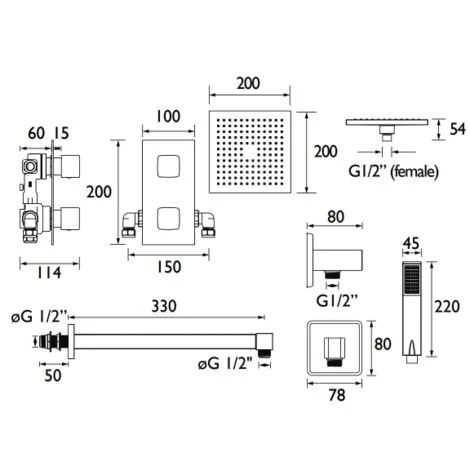 This shower pack has soft square handles on our Colbalt shower valve with integral two outlet diverter. It has a 200mm square fixed head with shower arm; a single function handset and hose with integral handset holder and wall outlet.