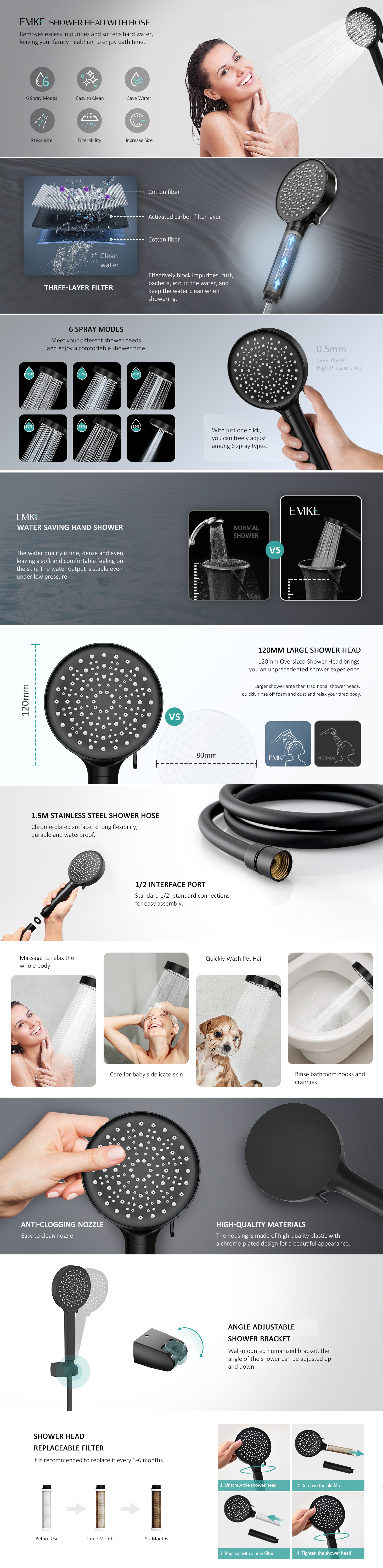 New Filter Technology: EMKE shower heads use a carbon fibre filter that is easy to install and use and has three filter layers to filter impurities multiple times and remove chlorine, heavy metals, rust, odours and disinfection by-products from  the water more efficiently. Purifies the water and provides a pleasant shower environment.