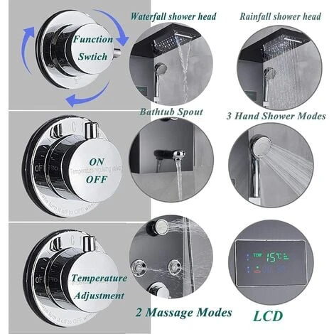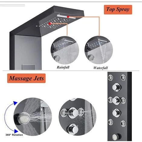 Shower panel with 5 functions:rainfall and waterfall shower head, handheld shower sprayer,body massage jets,tub spout,for daily bathing and cleaning