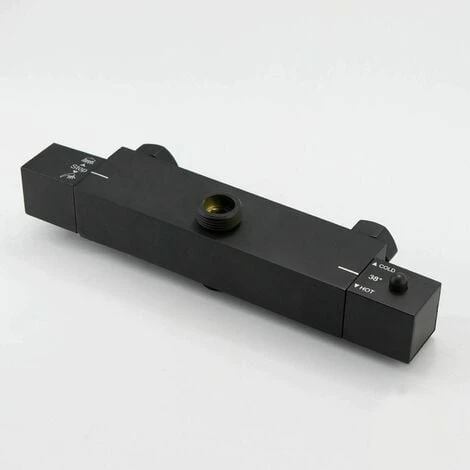 - Square thermostatic mixing valve of brass construction with built-in diverter and black matte finish.