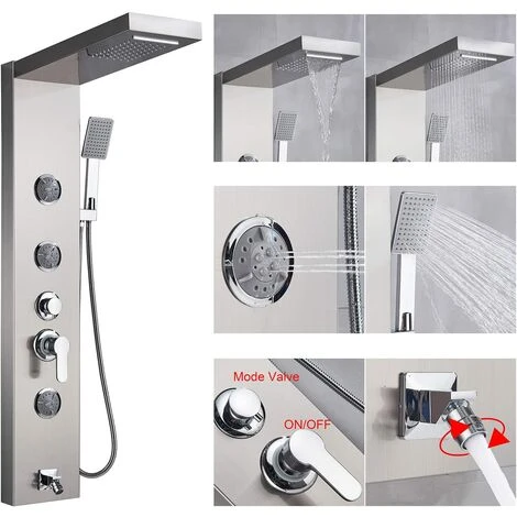 SUGUWORD multi-function stainless steel shower Tower panel,Sleek modern and impressive design,3 body jets design, full body coverage, let you enjoy the hearty bathing experience. Waterfall and rainfall mode make you feel in the nature and get relaxed.
