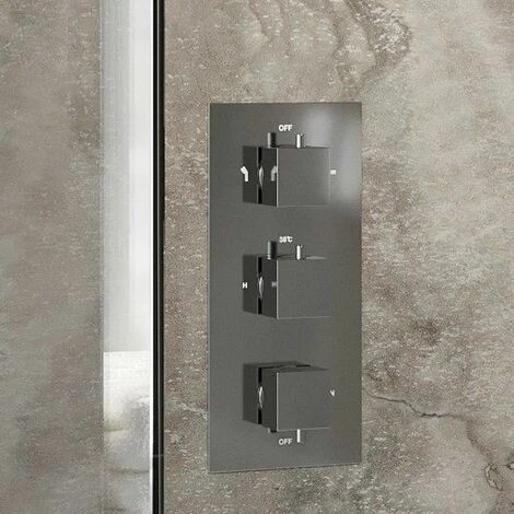 Main component overview This thermostatic bath shower mixer comes complete with a large 200mm drencher head, single spray shower handset, bath filler control and a triple outlet valve to control each one precisely. The valve itself is made from solid brass for total reliability. |