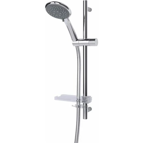 - Five-spray shower head, hose, slide rail and bottle tray included in price